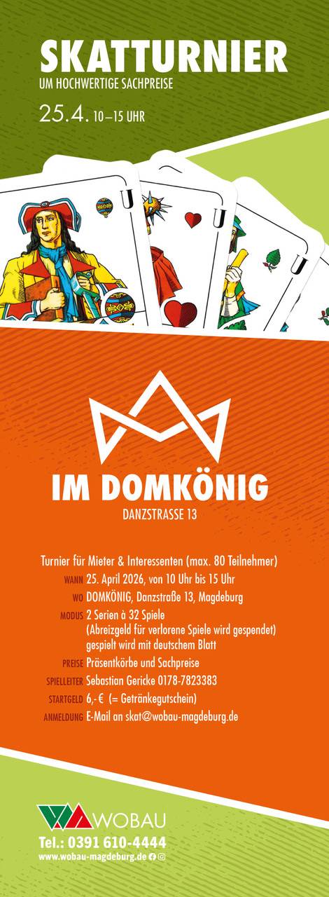 Donnerstag, 19.03.2026 Bereit für Runde 2? Am 25. April 2026 ist es wieder soweit: Das große WOBAU-Skatturnier lädt erneut alle Mieterinnen, Mieter und Interessierten zum Mitspielen ein. Von 10 bis 15 Uhr fliegen die Karten. Dieses Mal sogar mit maximal 80 Teilnehmern, so wird’s ein spannender, aber zugleich familiärer Wettbewerb. Gespielt werden zwei Serien à 32 Spiele, und für die Gewinner gibt es attraktive Präsentkörbe und hochwertige Sachpreise. Das Beste: Die Startgebühr von 6 Euro ist direkt ein Getränkegutschein, und das Abreizgeld für verlorene Spiele kommt einem guten Zweck zugute. So macht Mitspielen gleich doppelt Freude. Domkönig: Ein Ort zum Genießen Gespielt wird im Domkönig, einem echten Wohlfühlort mitten in Magdeburg. Direkt am Dom und der Elbe gelegen, verbindet das Lokal gemütliche Atmosphäre mit kulinarischem Genuss. Über 12 Biersorten, leckere Gerichte und das Gefühl, „für einen Abend König zu sein“ – all das macht den Domkönig zu einem beliebten Treffpunkt. Hier lässt sich der Alltag schnell vergessen, ob beim Feierabendbier oder beim gemeinsamen Anstoßen nach einem erfolgreichen Spiel. Jetzt noch anmelden Wer dabei sein möchte, meldet sich einfach per E-Mail an skat@wobau-magdeburg.de oder über die WOBAU-Zentrale am Breiten Weg 1 an. Da die Plätze begrenzt sind, gilt: schnell sein lohnt sich! Also: Karten mischen, Platz sichern und dabei sein – beim Skatturnier im Domkönig! Flyer